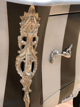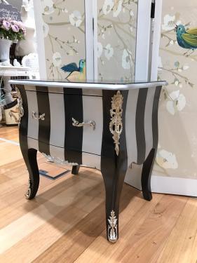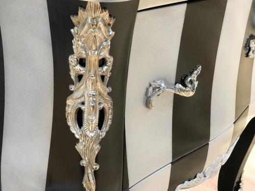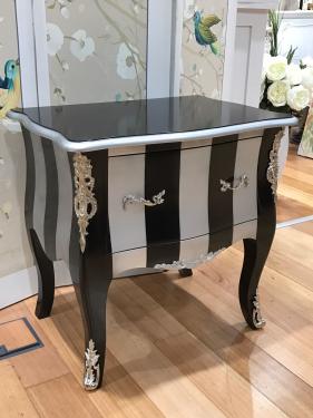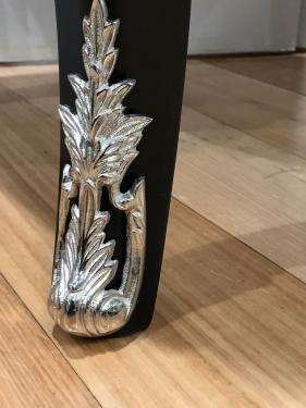 This astonishing side table in Black and Silver colors, and metal cladded corners, and Leaf handles