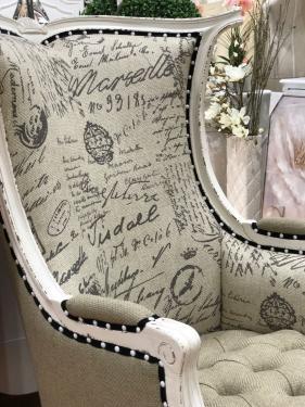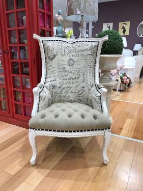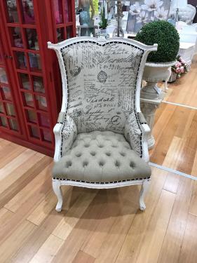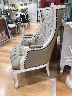 French Wing Chair, in Antique White, unholstered in Stylish Fabric of Paris Theme, Button Stripes.
