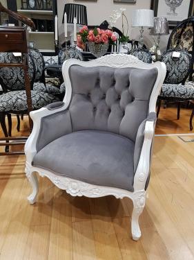 Classic Louis Arm Chair in Antique White and Dark Grey Fabric