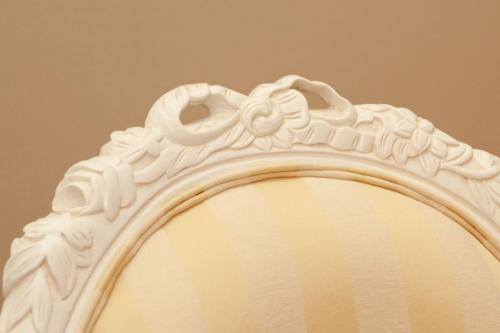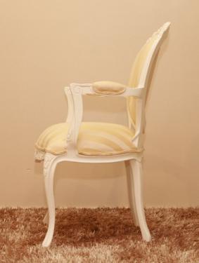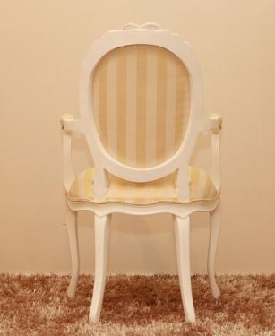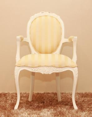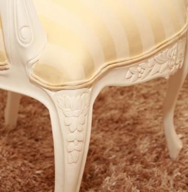 Antique White French Arm Chair, in Cream and Gold Stripes upholstery,