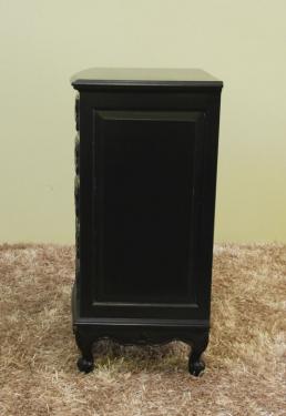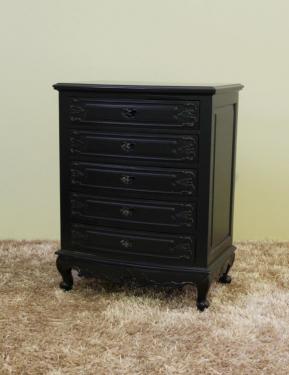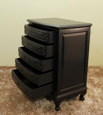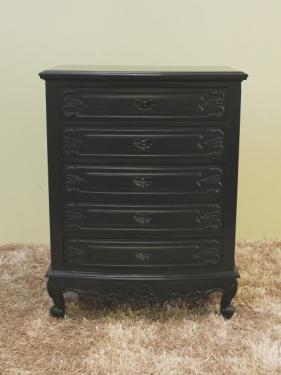 This unique serpentine 5 drawer chest in antique white looks even more elegant and classy due to its embedded handlebar in the shape of an open shell. It comes with a black finish. Currently out of stock. To order only.