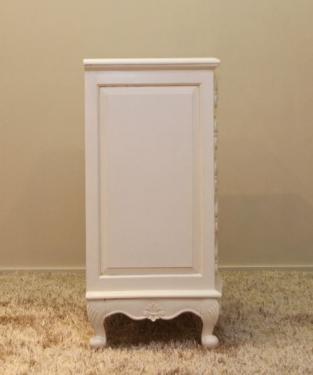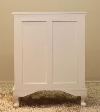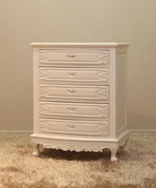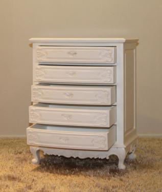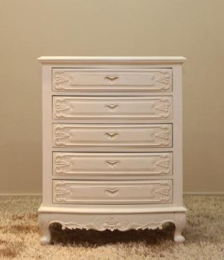 This unique serpentine 5 drawer chest in antique white looks even more elegant and classy due to its embedded handlebar in the shape of an open shell.