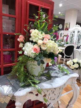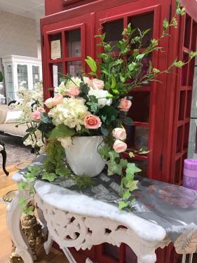 Flower Arrangement including white clay pot, approx height 75cm , width 55 cm and depth 45 cm