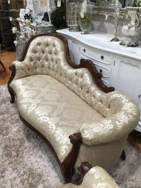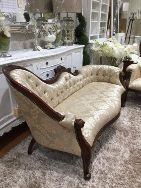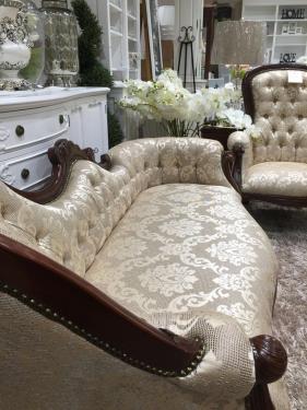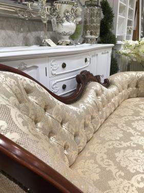 This chaise lounge with an uniquely contoured backrest is inviting to sit down and rest. This is upholstered in very unique quality fabric.